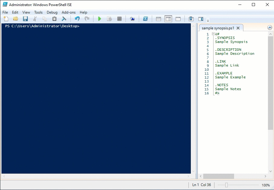 The first thing you should do when writing a PowerShell script is to start off with a comment based help. With comment based help at the start of your code you can use the command get-help ps_script.ps1 and the comment based help outputs. I usually just put necessary information about my script and some examples on how to use the script. You can also use the comment based help to keep track for code versions and even add notes on future updates and bugs you plan to fix in the future. I usually refer comment based help as a synopsis.